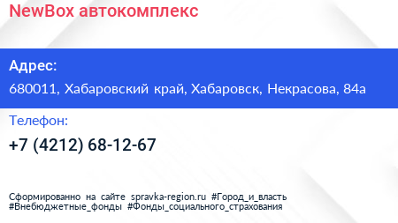 NewBox, автокомплекс по адресу 680011, Хабаровский край, Хабаровск, Некрасова, 84а в дальнейшем Организация, размещена в следующих категориях: