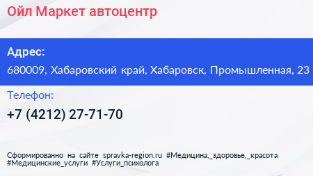 Ойл Маркет, автоцентр по адресу 680009, Хабаровский край, Хабаровск, Промышленная, 23 в дальнейшем Организация, размещена в следующих категориях: