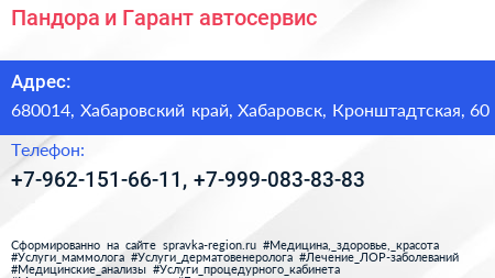Пандора и Гарант, автосервис по адресу 680014, Хабаровский край, Хабаровск, Кронштадтская, 60 в дальнейшем Организация, размещена в следующих категориях: