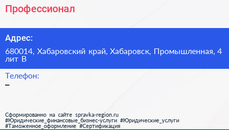 Профессионал по адресу 680014, Хабаровский край, Хабаровск, Промышленная, 4 лит В в дальнейшем Организация, размещена в следующих категориях: