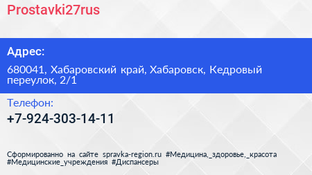 Prostavki27rus по адресу 680041, Хабаровский край, Хабаровск, Кедровый переулок, 2/1 в дальнейшем Организация, размещена в следующих категориях:
