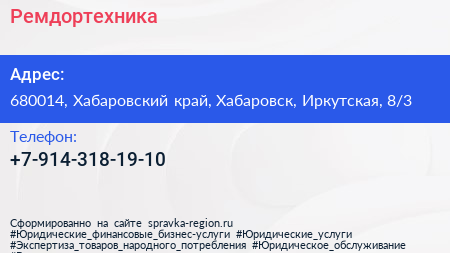 Ремдортехника по адресу 680014, Хабаровский край, Хабаровск, Иркутская, 8/3 в дальнейшем Организация, размещена в следующих категориях: