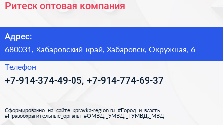 Ритеск, оптовая компания по адресу 680031, Хабаровский край, Хабаровск, Окружная, 6 в дальнейшем Организация, размещена в следующих категориях:
