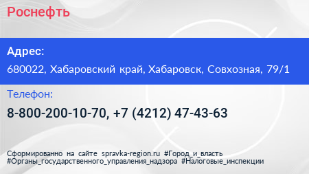Роснефть по адресу 680022, Хабаровский край, Хабаровск, Совхозная, 79/1 в дальнейшем Организация, размещена в следующих категориях: