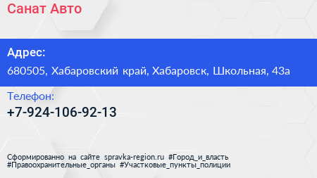 Санат-Авто по адресу 680505, Хабаровский край, Хабаровск, Школьная, 43а в дальнейшем Организация, размещена в следующих категориях: