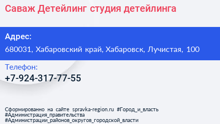 Саваж Детейлинг, студия детейлинга по адресу 680031, Хабаровский край, Хабаровск, Лучистая, 100 в дальнейшем Организация, размещена в следующих категориях: