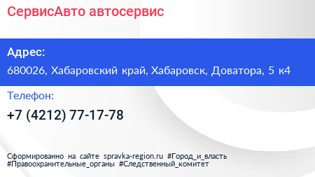 СервисАвто, автосервис по адресу 680026, Хабаровский край, Хабаровск, Доватора, 5 к4 в дальнейшем Организация, размещена в следующих категориях: