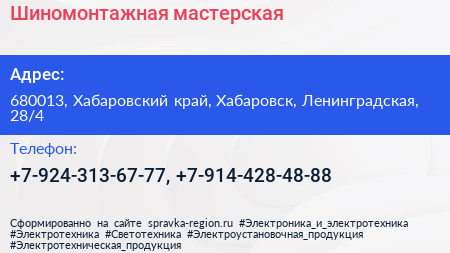 Шиномонтажная мастерская по адресу 680013, Хабаровский край, Хабаровск, Ленинградская, 28/4 в дальнейшем Организация, размещена в следующих категориях: