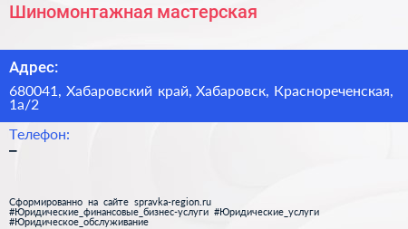 Шиномонтажная мастерская по адресу 680041, Хабаровский край, Хабаровск, Краснореченская, 1а/2 в дальнейшем Организация, размещена в следующих категориях: