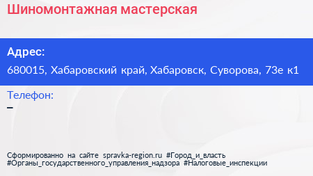 Шиномонтажная мастерская по адресу 680015, Хабаровский край, Хабаровск, Суворова, 73е к1 в дальнейшем Организация, размещена в следующих категориях: