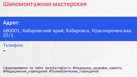 Шиномонтажная мастерская по адресу 680001, Хабаровский край, Хабаровск, Краснореченская, 25/1 в дальнейшем Организация, размещена в следующих категориях: