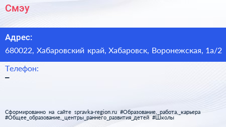 Смэу по адресу 680022, Хабаровский край, Хабаровск, Воронежская, 1а/2 в дальнейшем Организация, размещена в следующих категориях: