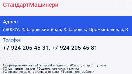 СтандартМашинери по адресу 680009, Хабаровский край, Хабаровск, Промышленная, 3 в дальнейшем Организация, размещена в следующих категориях: