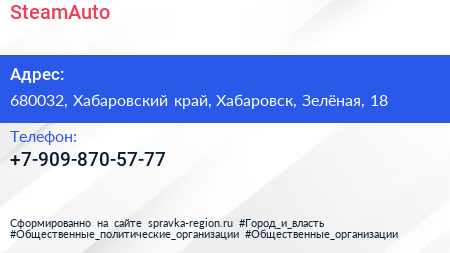 SteamAuto по адресу 680032, Хабаровский край, Хабаровск, Зелёная, 18 в дальнейшем Организация, размещена в следующих категориях: