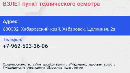 ВЗЛЕТ, пункт технического осмотра по адресу 680032, Хабаровский край, Хабаровск, Целинная, 2а в дальнейшем Организация, размещена в следующих категориях:
