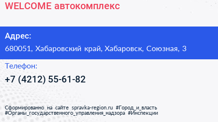 WELCOME, автокомплекс по адресу 680051, Хабаровский край, Хабаровск, Союзная, 3 в дальнейшем Организация, размещена в следующих категориях: