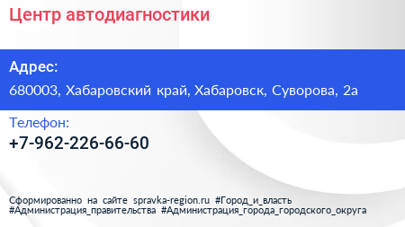 Центр автодиагностики по адресу 680003, Хабаровский край, Хабаровск, Суворова, 2а в дальнейшем Организация, размещена в следующих категориях: