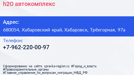 h2O, автокомплекс по адресу 680054, Хабаровский край, Хабаровск, Трёхгорная, 97а в дальнейшем Организация, размещена в следующих категориях: