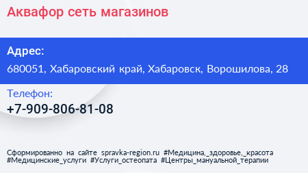 Аквафор, сеть магазинов по адресу 680051, Хабаровский край, Хабаровск, Ворошилова, 28 в дальнейшем Организация, размещена в следующих категориях: