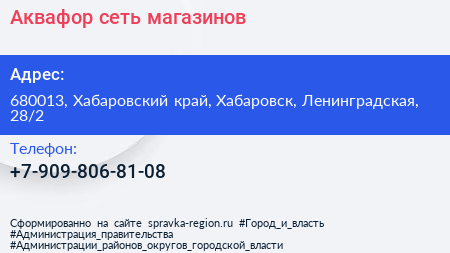 Аквафор, сеть магазинов по адресу 680013, Хабаровский край, Хабаровск, Ленинградская, 28/2 в дальнейшем Организация, размещена в следующих категориях: