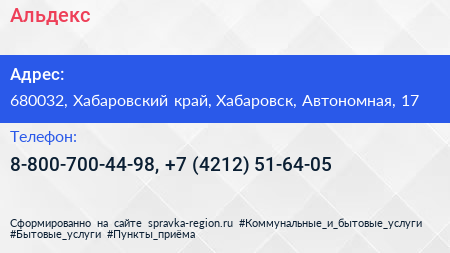 Альдекс по адресу 680032, Хабаровский край, Хабаровск, Автономная, 17 в дальнейшем Организация, размещена в следующих категориях: