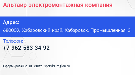 Альтаир, электромонтажная компания по адресу 680009, Хабаровский край, Хабаровск, Промышленная, 3 в дальнейшем Организация, размещена в следующих категориях: