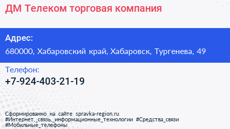 ДМ Телеком, торговая компания по адресу 680000, Хабаровский край, Хабаровск, Тургенева, 49 в дальнейшем Организация, размещена в следующих категориях: