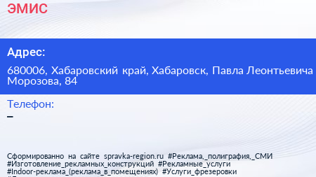 ЭМИС по адресу 680006, Хабаровский край, Хабаровск, Павла Леонтьевича Морозова, 84 в дальнейшем Организация, размещена в следующих категориях: