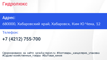Гидролюкс по адресу 680000, Хабаровский край, Хабаровск, Ким Ю Чена, 12 в дальнейшем Организация, размещена в следующих категориях: