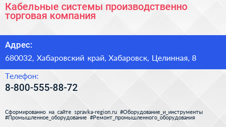 Кабельные системы, производственно-торговая компания по адресу 680032, Хабаровский край, Хабаровск, Целинная, 8 в дальнейшем Организация, размещена в следующих категориях: