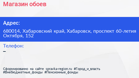 Магазин обоев по адресу 680014, Хабаровский край, Хабаровск, проспект 60-летия Октября, 152 в дальнейшем Организация, размещена в следующих категориях: