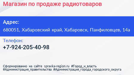 Магазин по продаже радиотоваров по адресу 680051, Хабаровский край, Хабаровск, Панфиловцев, 14а в дальнейшем Организация, размещена в следующих категориях: