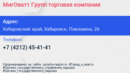 МигОватт Групп, торговая компания по адресу Хабаровский край, Хабаровск, Павловича, 26 в дальнейшем Организация, размещена в следующих категориях: