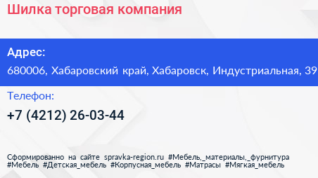 Шилка, торговая компания по адресу 680006, Хабаровский край, Хабаровск, Индустриальная, 39 в дальнейшем Организация, размещена в следующих категориях: