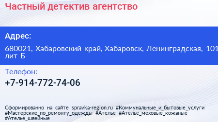 Частный детектив, агентство по адресу 680021, Хабаровский край, Хабаровск, Ленинградская, 101 лит Б в дальнейшем Организация, размещена в следующих категориях: