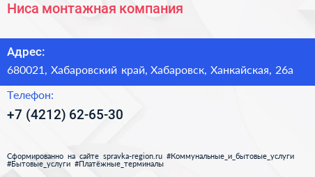 Ниса, монтажная компания по адресу 680021, Хабаровский край, Хабаровск, Ханкайская, 26а в дальнейшем Организация, размещена в следующих категориях: