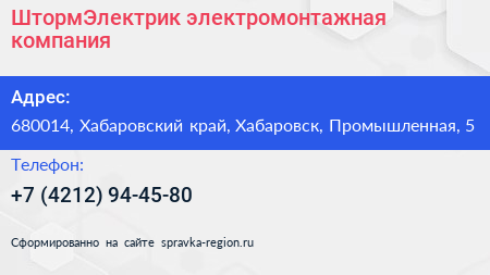 ШтормЭлектрик, электромонтажная компания по адресу 680014, Хабаровский край, Хабаровск, Промышленная, 5 в дальнейшем Организация, размещена в следующих категориях: