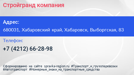 Стройгранд, компания по адресу 680031, Хабаровский край, Хабаровск, Выборгская, 83 в дальнейшем Организация, размещена в следующих категориях: