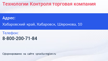 Технологии Контроля, торговая компания по адресу Хабаровский край, Хабаровск, Шеронова, 10 в дальнейшем Организация, размещена в следующих категориях: