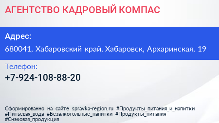 АГЕНТСТВО КАДРОВЫЙ КОМПАС по адресу 680041, Хабаровский край, Хабаровск, Архаринская, 19 в дальнейшем Организация, размещена в следующих категориях: