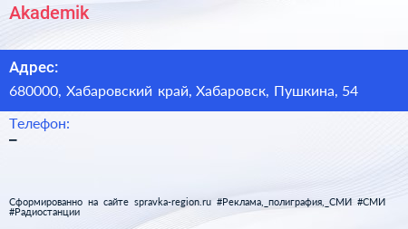 Akademik по адресу 680000, Хабаровский край, Хабаровск, Пушкина, 54 в дальнейшем Организация, размещена в следующих категориях:
