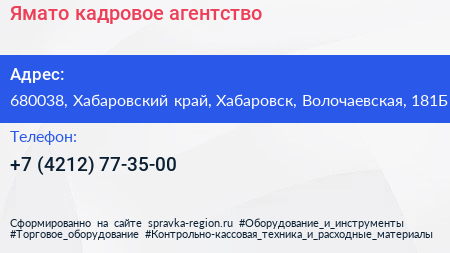 Ямато, кадровое агентство по адресу 680038, Хабаровский край, Хабаровск, Волочаевская, 181Б в дальнейшем Организация, размещена в следующих категориях: