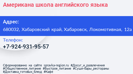 Американа, школа английского языка по адресу 680032, Хабаровский край, Хабаровск, Локомотивная, 12а в дальнейшем Организация, размещена в следующих категориях: