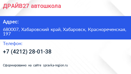 ДРАЙВ27, автошкола по адресу 680007, Хабаровский край, Хабаровск, Краснореченская, 197 в дальнейшем Организация, размещена в следующих категориях: