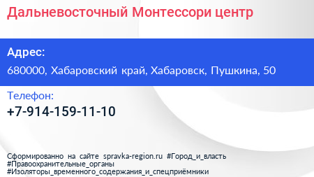 Дальневосточный Монтессори-центр по адресу 680000, Хабаровский край, Хабаровск, Пушкина, 50 в дальнейшем Организация, размещена в следующих категориях:
