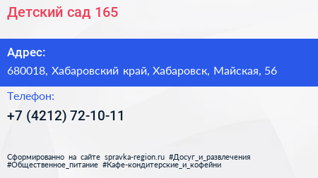 Детский сад №165 по адресу 680018, Хабаровский край, Хабаровск, Майская, 56 в дальнейшем Организация, размещена в следующих категориях: