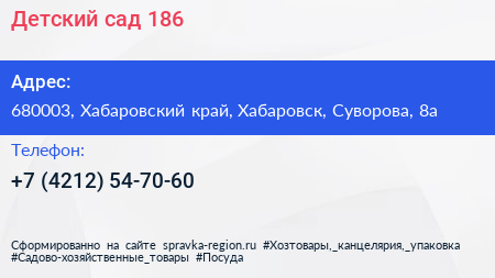 Детский сад №186 по адресу 680003, Хабаровский край, Хабаровск, Суворова, 8а в дальнейшем Организация, размещена в следующих категориях: