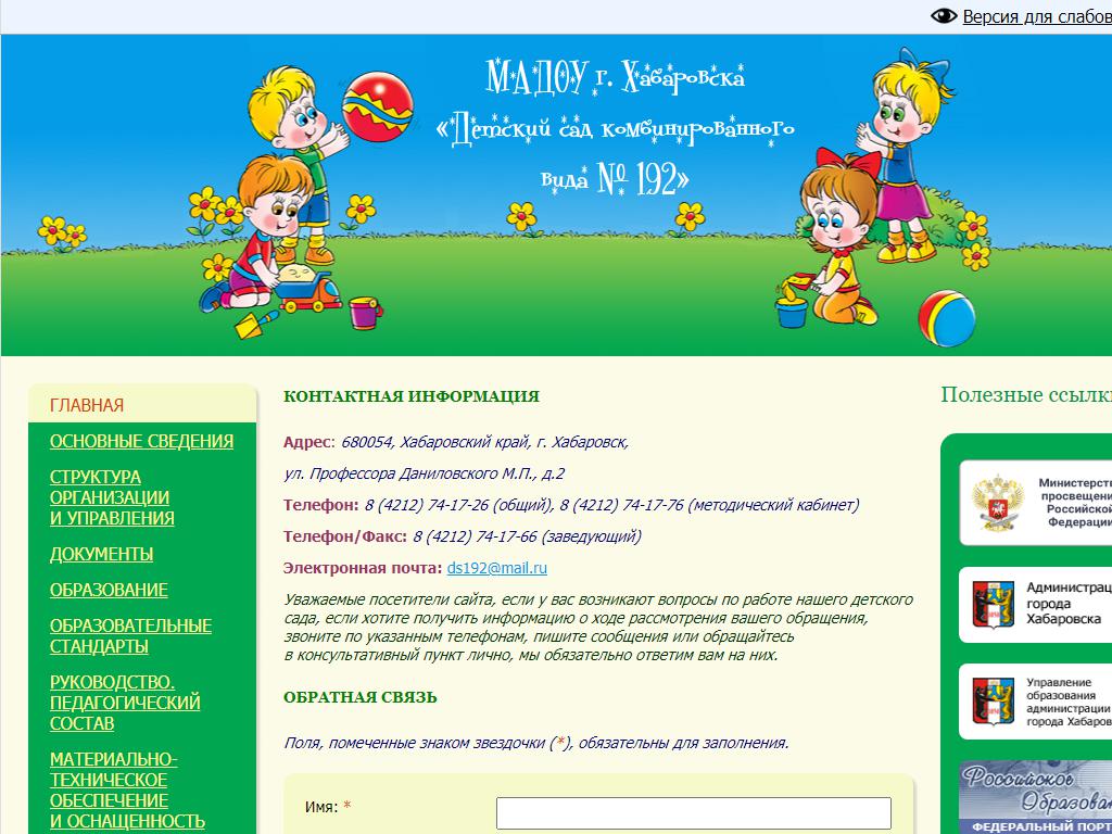 Детский сад №192 комбинированного вида по адресу 680054, Хабаровский край, Хабаровск, Профессора Даниловского, 2 в дальнейшем Организация, размещена в следующих категориях:
