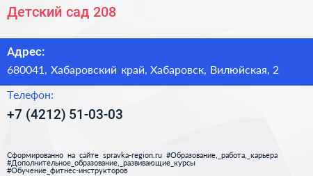 Детский сад №208 по адресу 680041, Хабаровский край, Хабаровск, Вилюйская, 2 в дальнейшем Организация, размещена в следующих категориях: