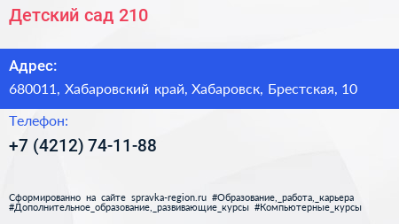 Детский сад №210 по адресу 680011, Хабаровский край, Хабаровск, Брестская, 10 в дальнейшем Организация, размещена в следующих категориях: